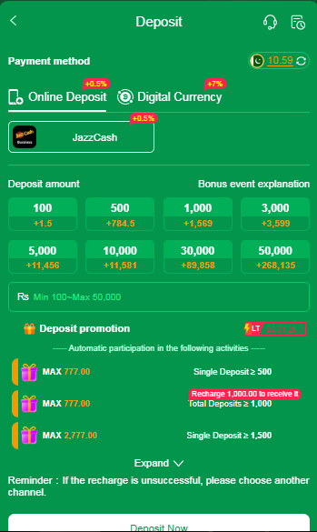 To play TD777 games, you need to deposit money into your account. DT777 GAME supports popular and secure payment options such as Easypaisa, JazzCash, and bank transfer. Select the amount you want to deposit, follow the steps, and your account will be ready for gameplay.